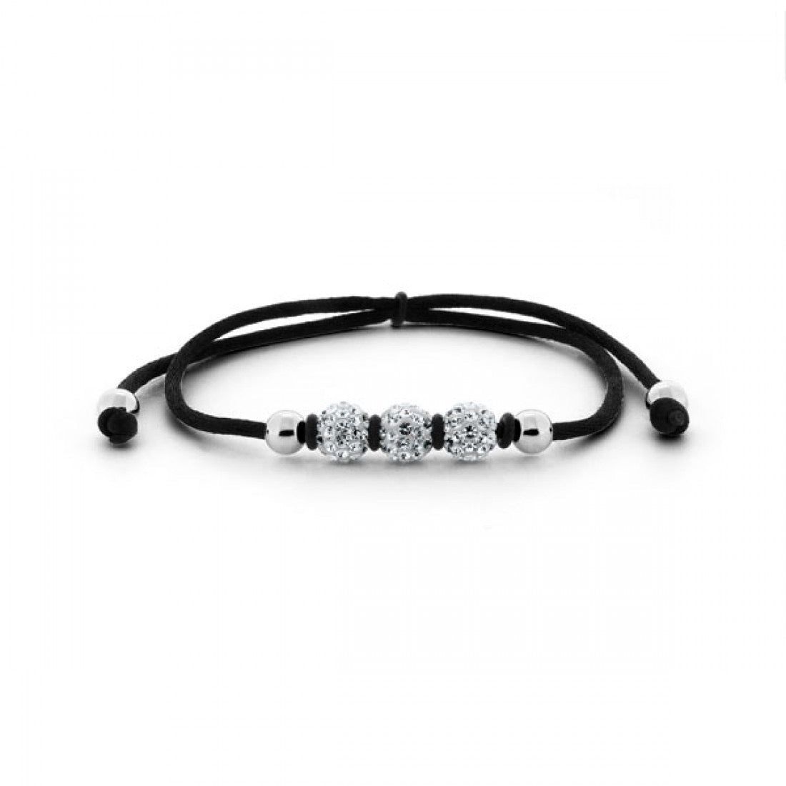 Black string bracelet with 3 sparkling white crystal ball 8mm and silver beads 6mm. Adjustable size.