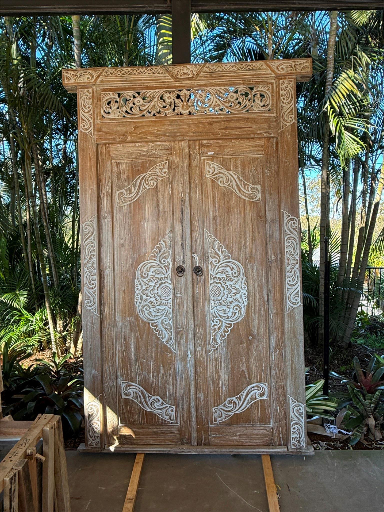 Authentic Balinese Door in Frame manufactured from Old/Recycled TEAK Timber and hand coloured.