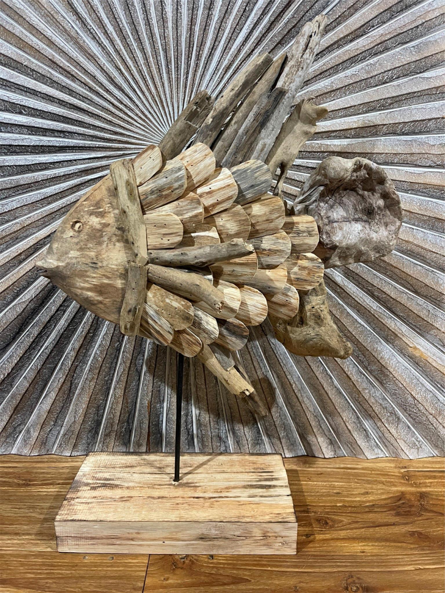 Beautifully hand crafted from driftwood is this gorgeous freestanding fish on stand. Great sculpture for your coastal styling.