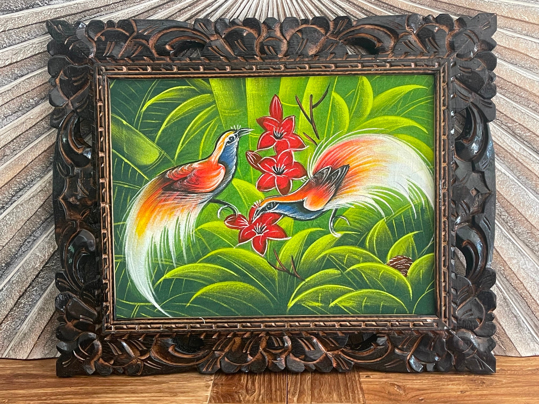This beautifully hand painted on canvas and framed in stunning Balinese Carved framework is just beautiful as can be seen in the photos provided.