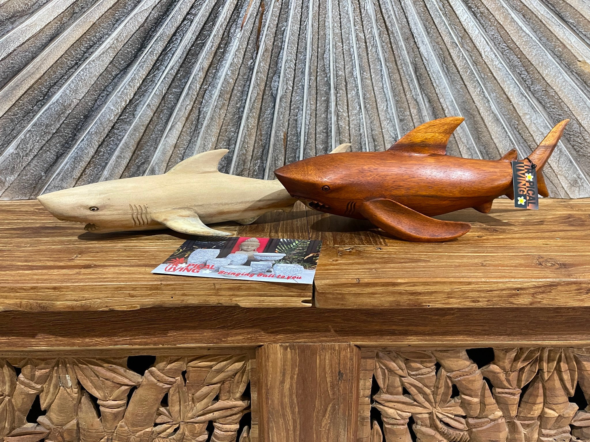 Beautifully hand carved from Suar Wood these beautifully hand carved shark sculptures will be a great talking point and great addition to your home decor or great gift for that someone special.