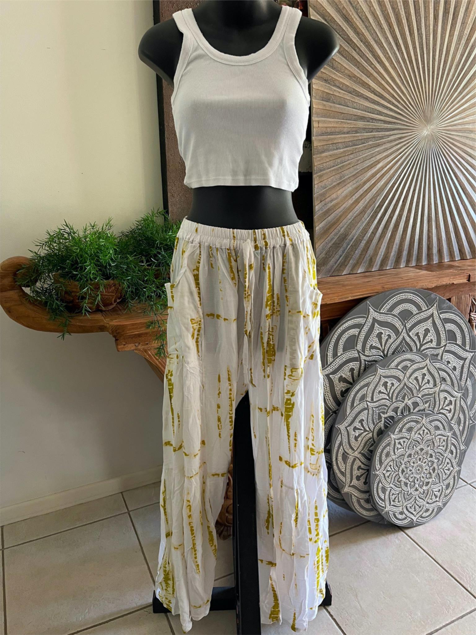 These pants have a wide, open leg as can be seen in the photo with some gathering that make them lovely and flowing.. They have 2 side pockets as can be seen in the photo.