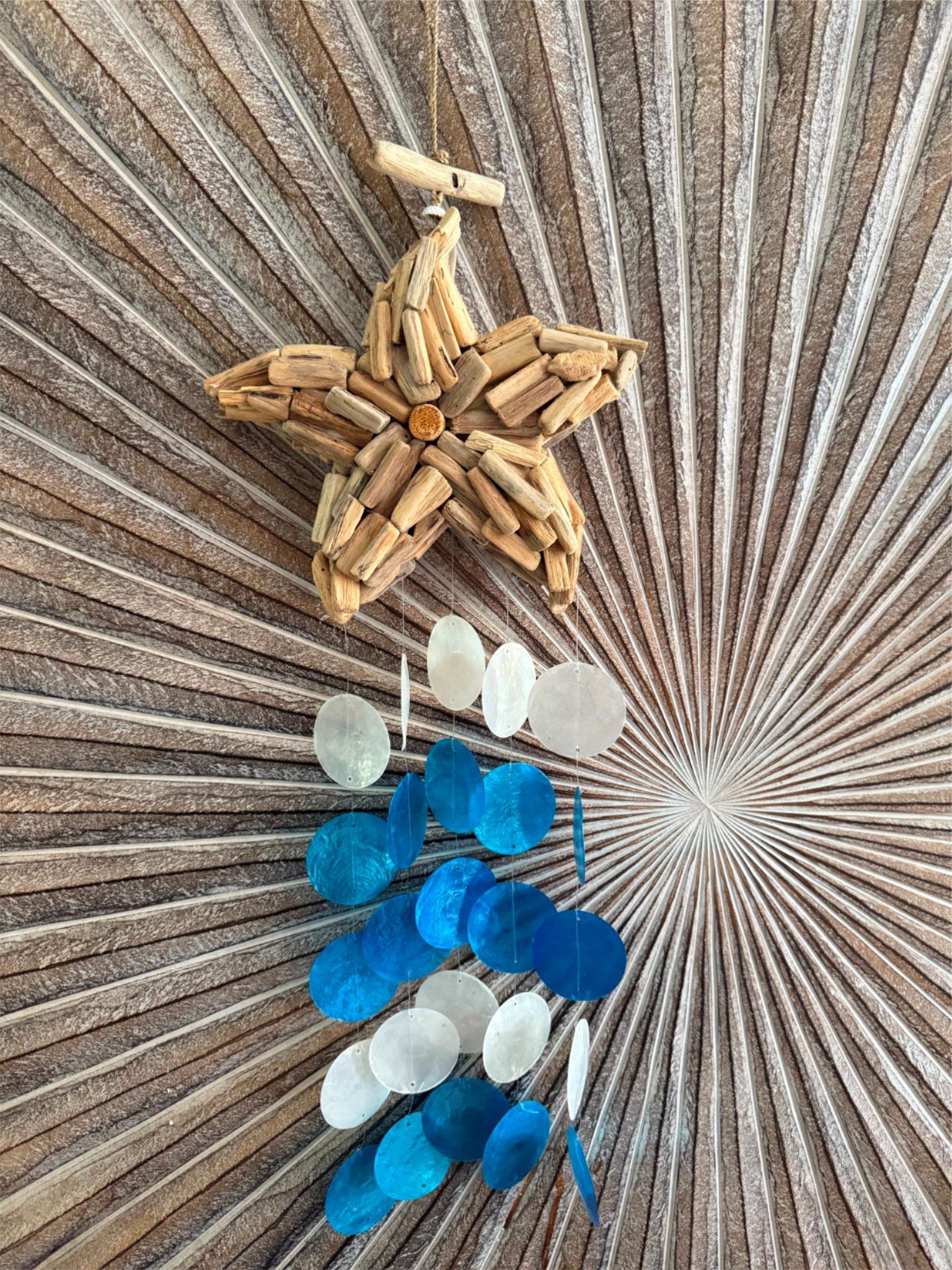 Beautifully handcrafted this double sided driftwood starfish with capiz shell chimes makes lovely sound as it swings along in the breeze.