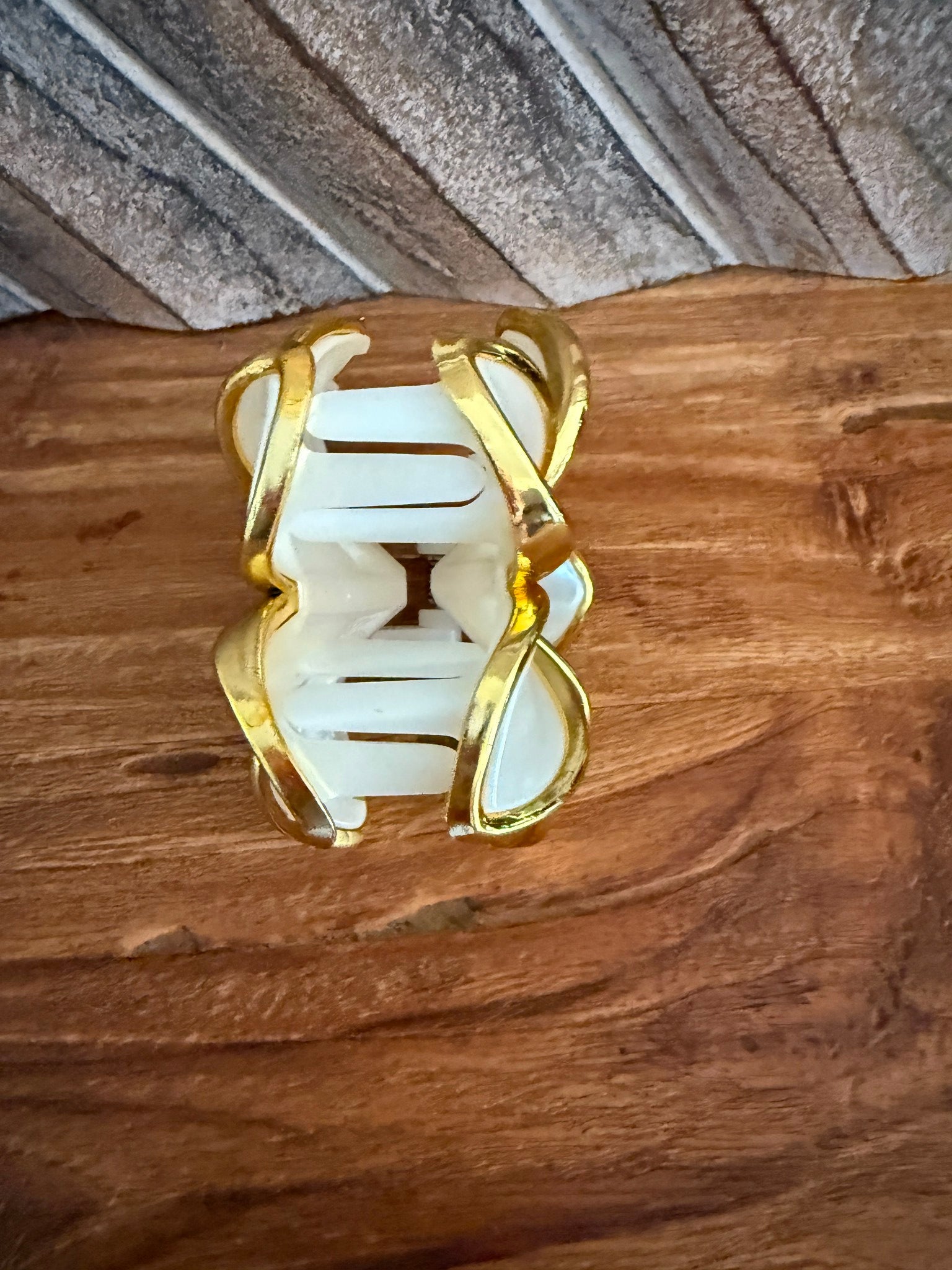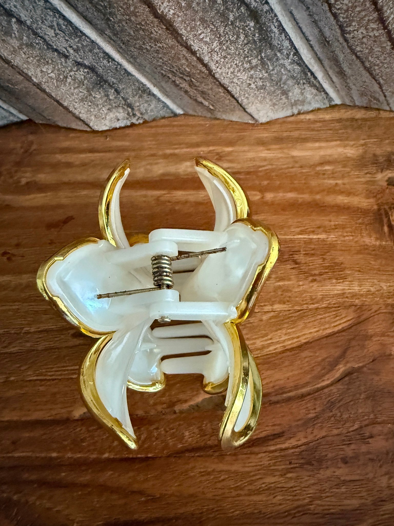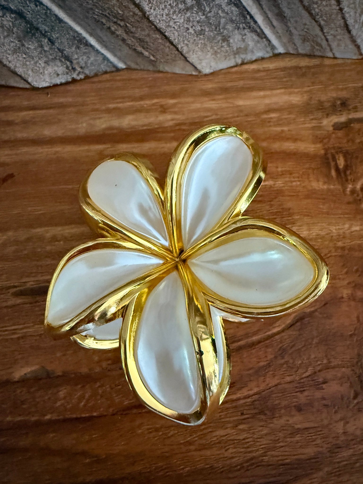 These beautiful frangipani plastic claw hair clips are so pretty as you can see in the photo, the gold trim adds that touch of glass to them and will look beautiful in your hair!!