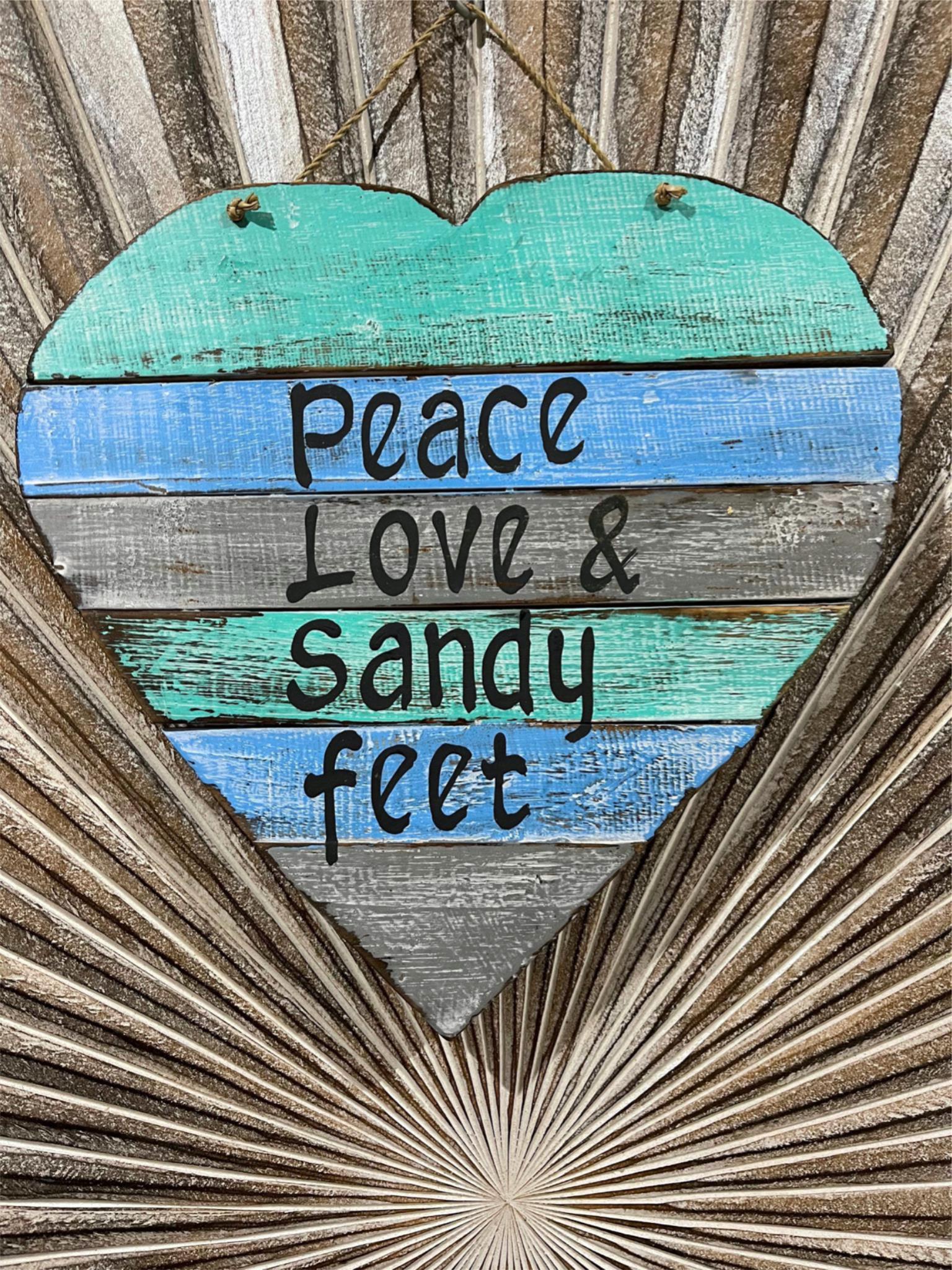 This hand crafted PEACE, LOVE & SANDY FEET heart shaped sign will add fun and charm to your entry, home or entertaining area's