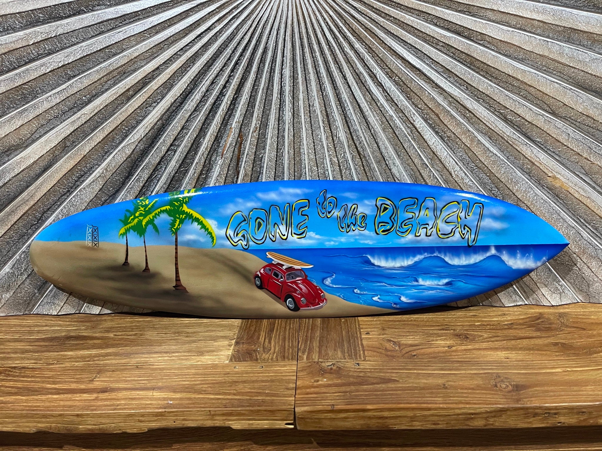 This mural style surfboard wall decor is hand crafted from timber and has a glossy air brushed finish.