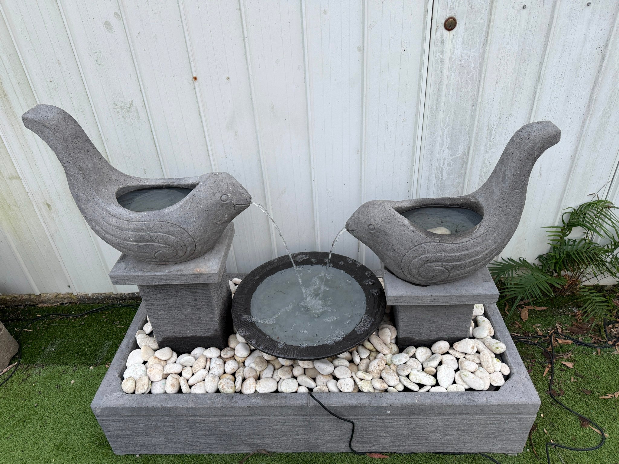 Bird lovers... You're going to love this water feature!! Beautifully hand crafted the 2 birds are spitting the water into the centre bowl which then overflows into the base as you can see in the photo. Add a bit of fun to your garden!! Pebbles displayed on the plate are not included and are for display purposes only.