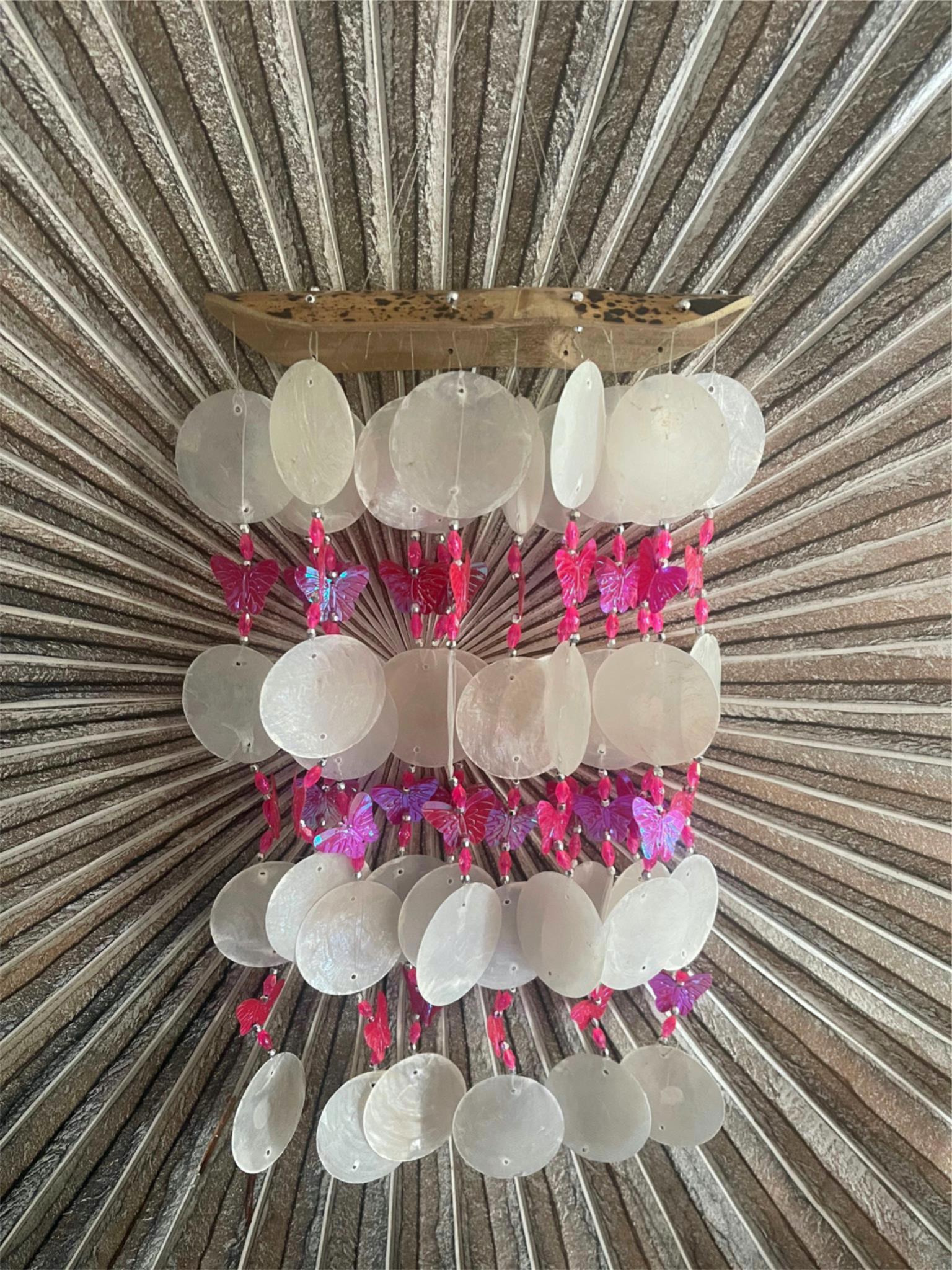 These capiz shell wind chimes with butterfly trim are absolutely lovely as you can see in the photo.
