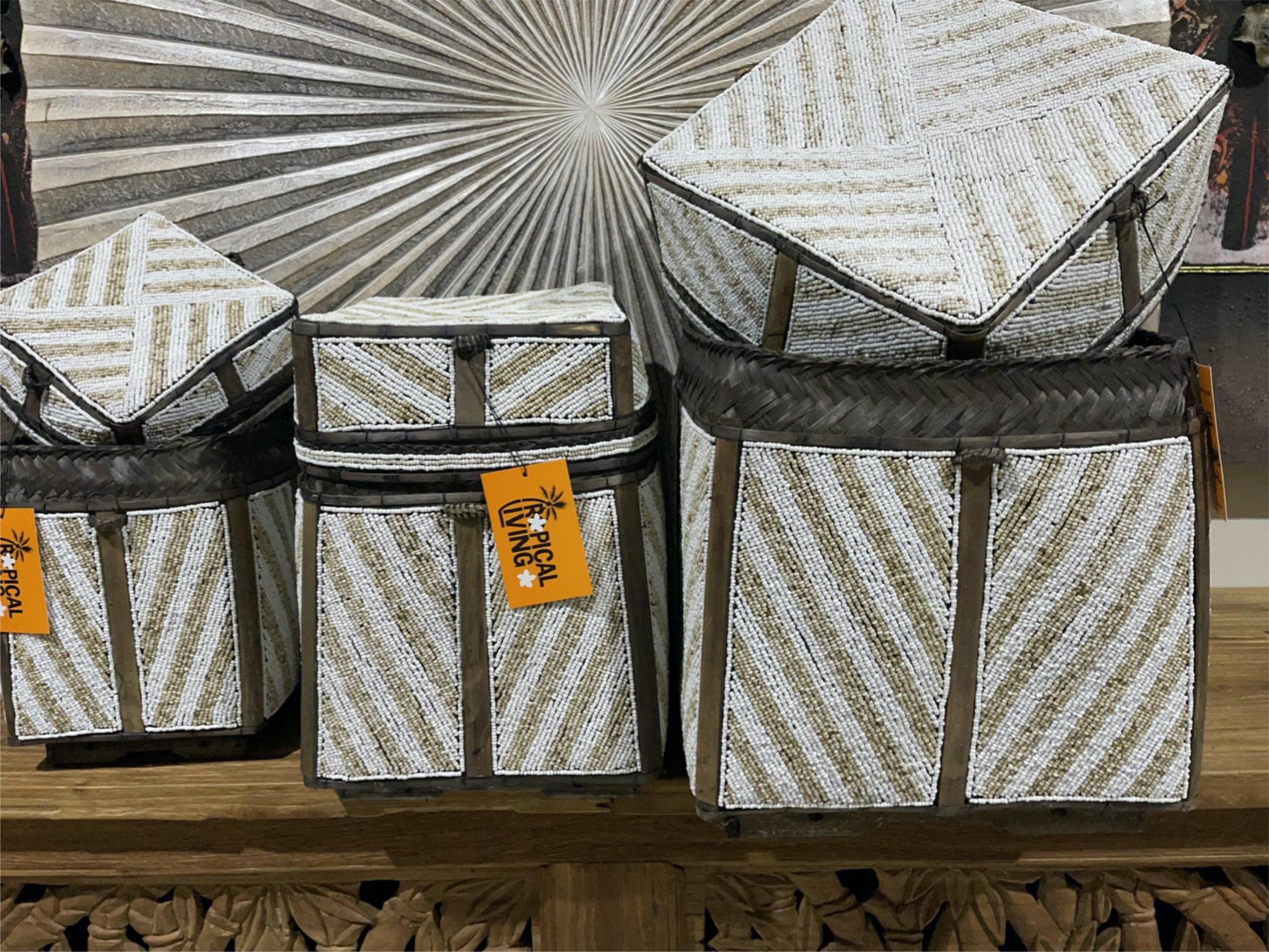 PLEASE NOTE: These baskets/boxes are completely handmade, hand woven and then the beads are appliqued by stitching and glue by hand. There may be slight imperfections, this is not a fault, it is the character of a handmade piece. Lids may be a little tricky to put on but they do fit...Balinese items are not designed to be perfect.