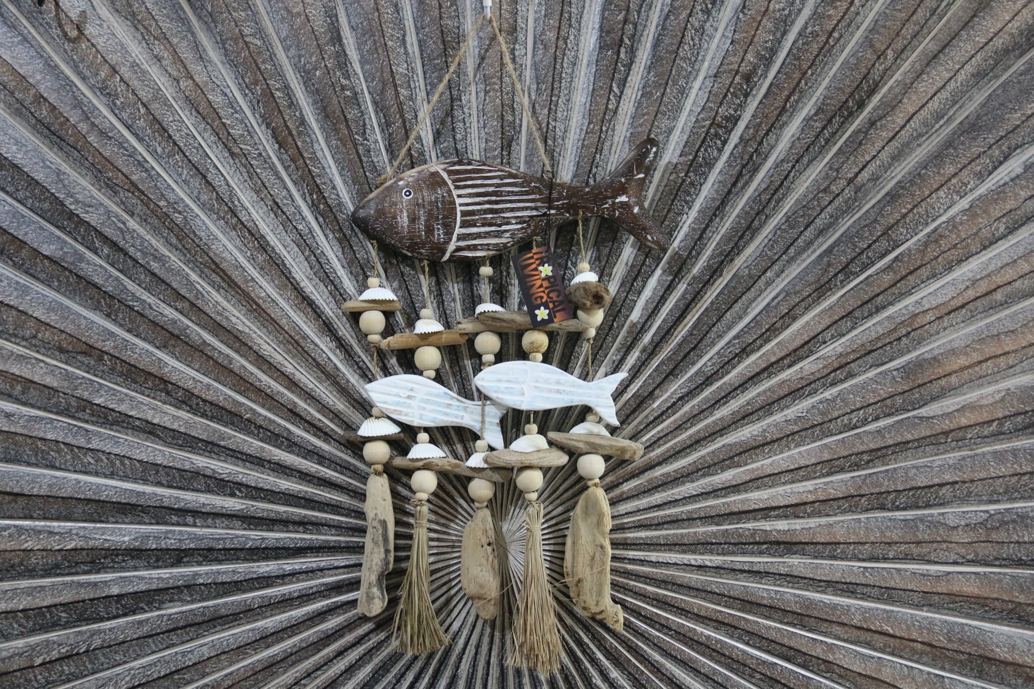 Beautifully hand crafted with nautical theming this FISH mobile is just gorgeous as you can see in the photos. With pebble, driftwood and grass tassel trim it will look great in your beach / coastal themed home.