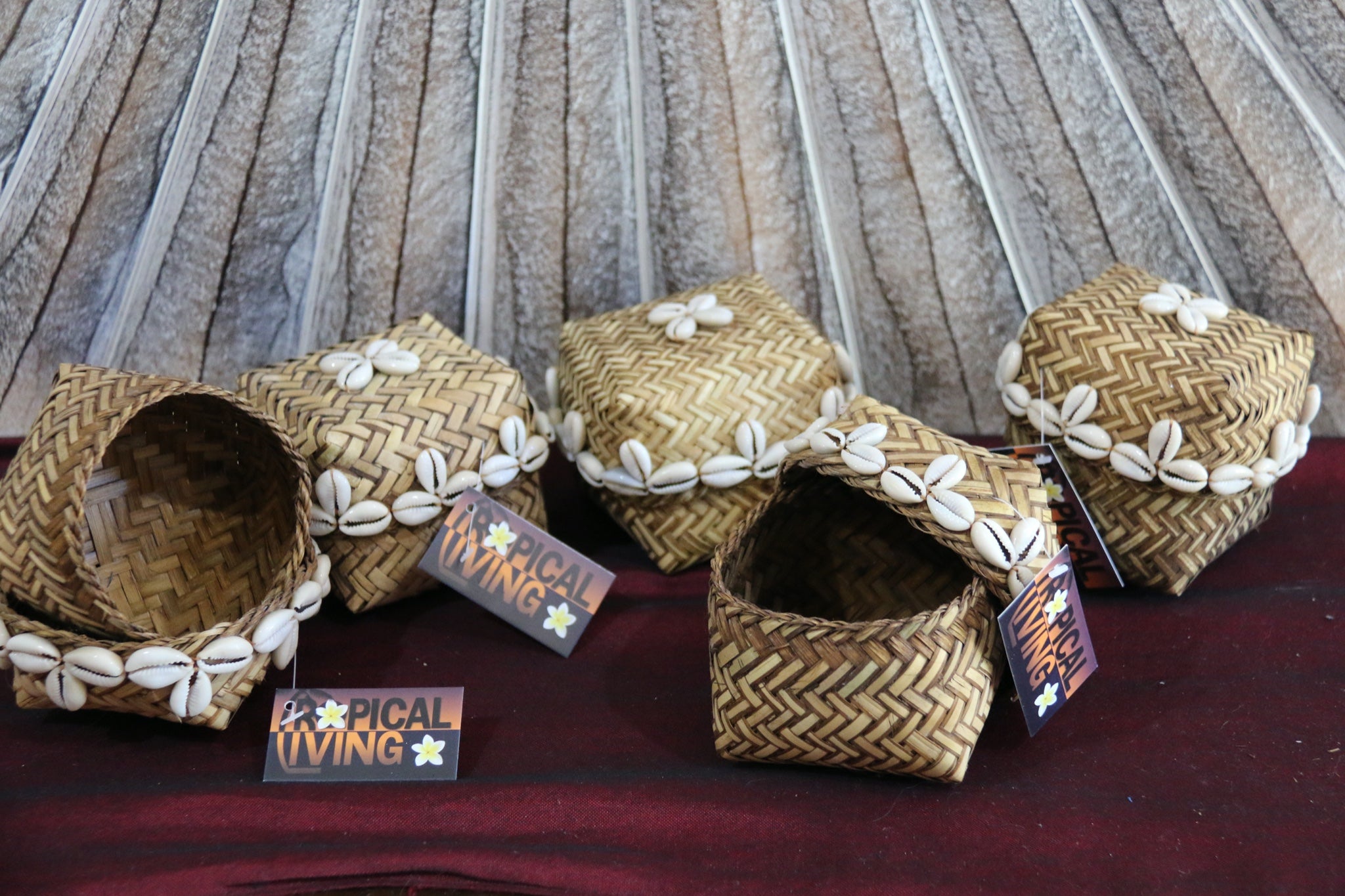 These beautifully hand crafted / woven baskets w/shell trim will add Tropical Charm to your home as well as provide handy storage space for those little items.