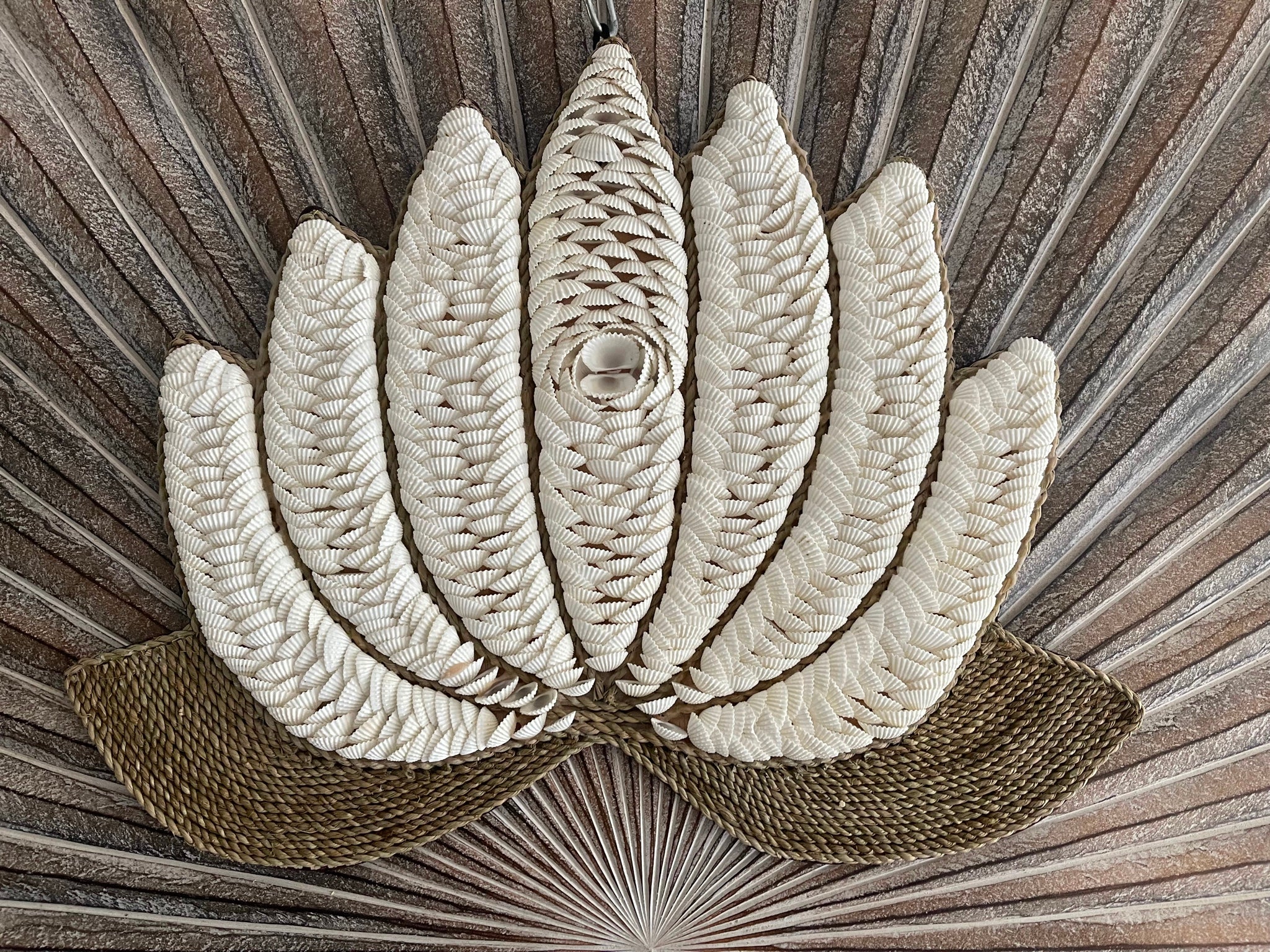 Beautifully and delicately handcrafted from shell with rope trim is this stunning lotus wall art... backing is wood as you can see in the photo and it comes complete with mounting hook.,