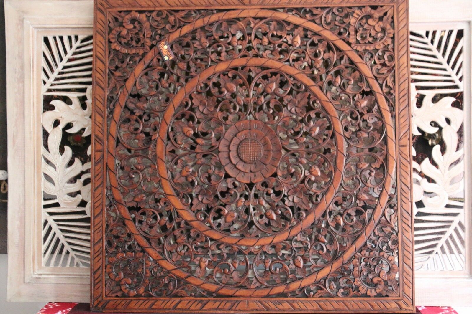 Add some authentic Balinese Charm to your walls with these large beautifully hand carved wood panels They look great on standard white / off white walls or even better on a feature wall!! Measurements are approx: 100cm x 100cmcm Lovely rich brown colourWe have many other decorative hand carved wood...