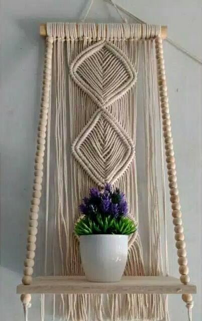 Beautifully hand crafted from off white / cream coloured cotton cord this macrame hanger with wooden shelf with bead trim is absolutely stunning as you can see in the photo and has so many uses...