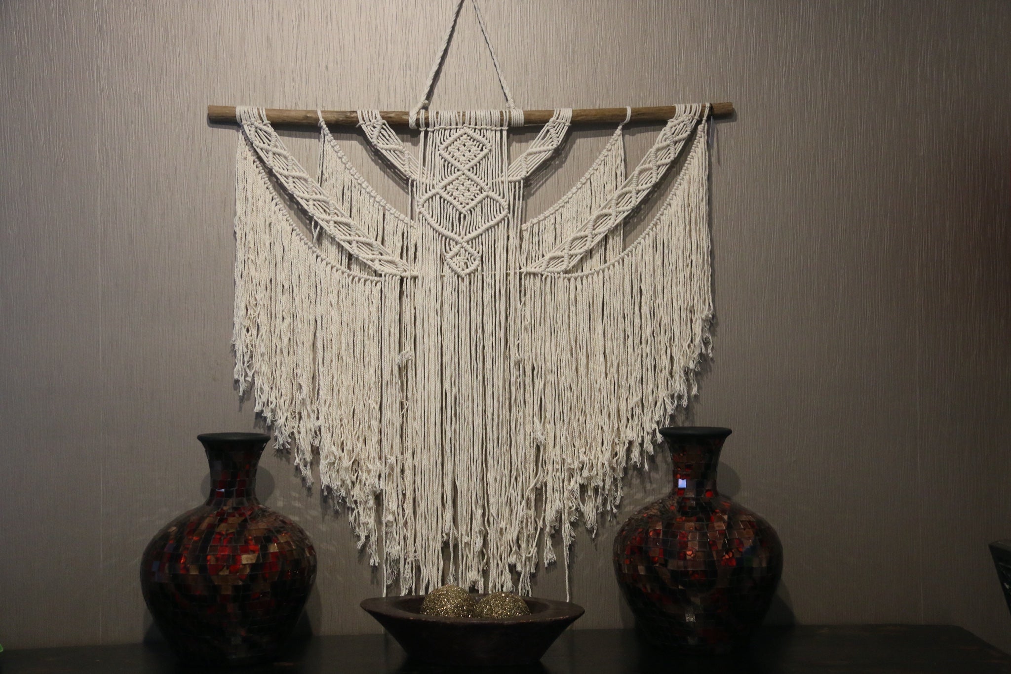 Beautifully hand crafted from off white / cream coloured cotton cord this macrame art will look fabulous on any wall in your home whether it be in your dining room above your special sideboard, above your bed acting as a bedhead in the bedroom, lounge room walls, front entry wall, hallways and stairways, even outdoor rooms... this piece is stunning!!