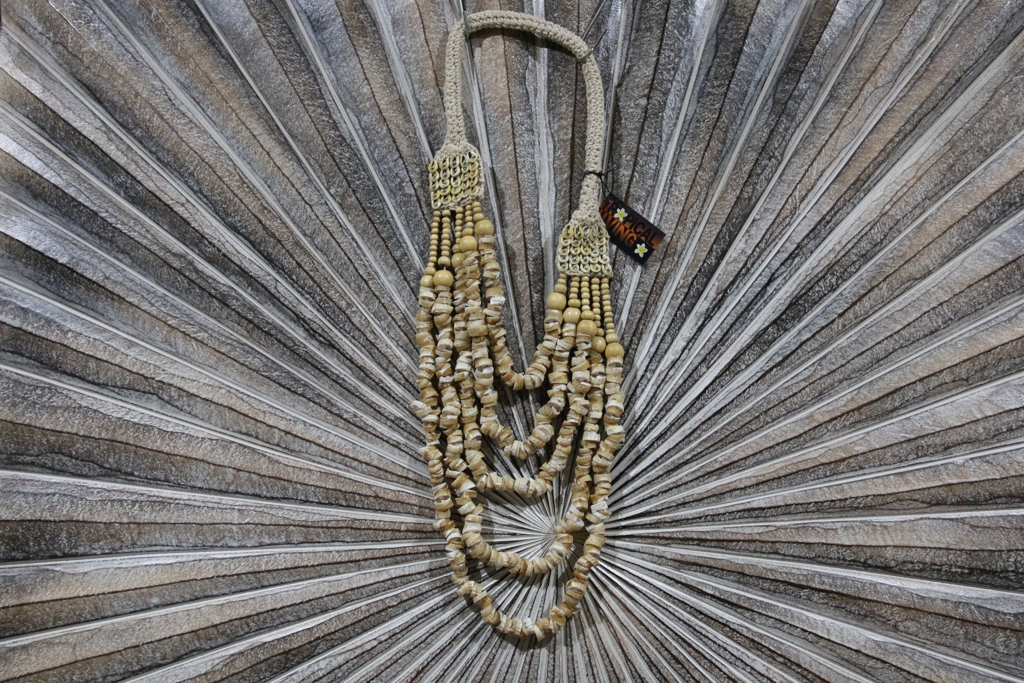 Versatile piece, can be placed on statued, around the neck of a floor vase or just placed on a wall with hooks... Amazing handcrafted piece.
