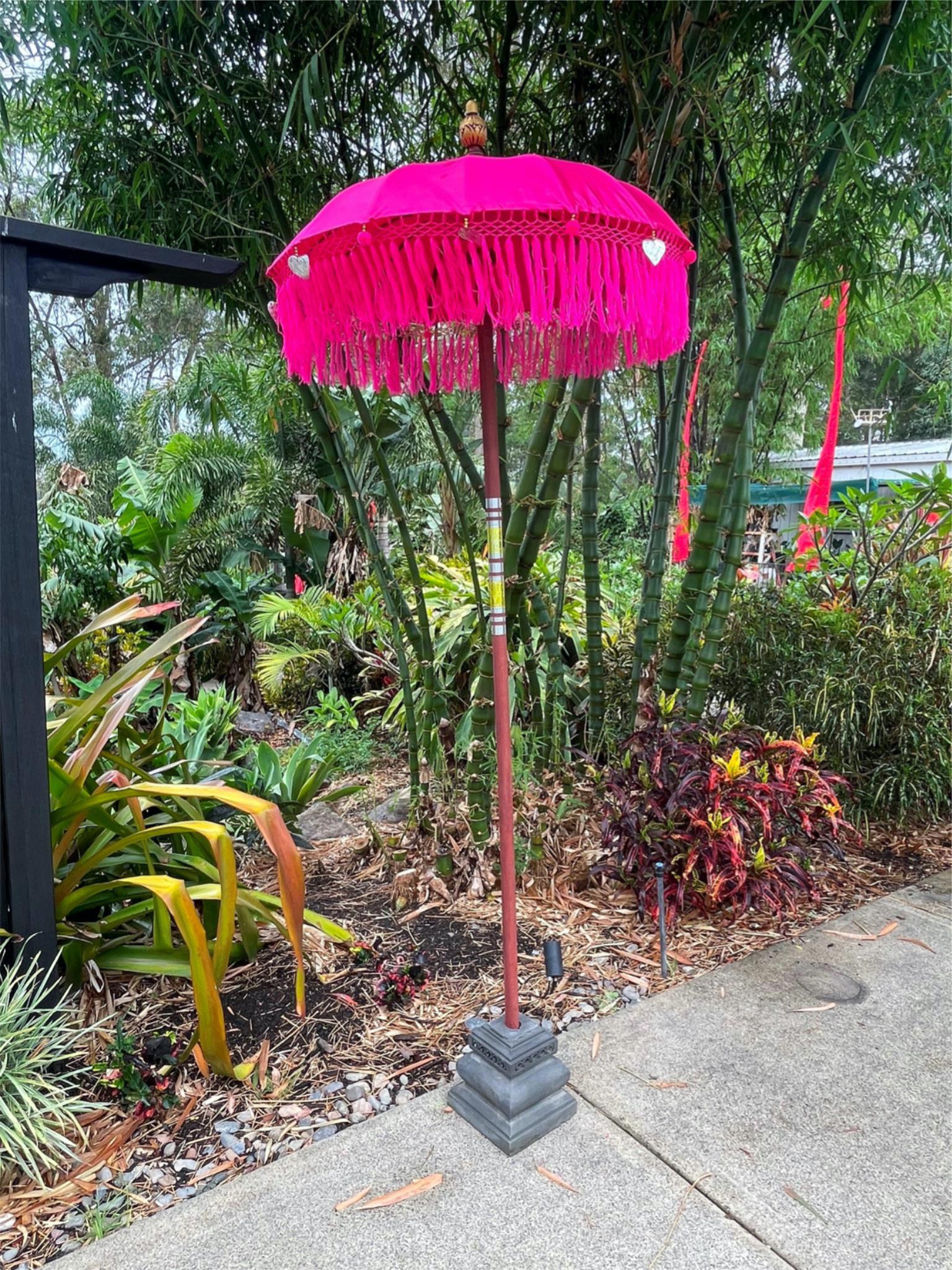 Add colour and Balinese charm to your garden or pool area with this gorgeous Balinese ceremony umbrella complete with beautiful decorative trim