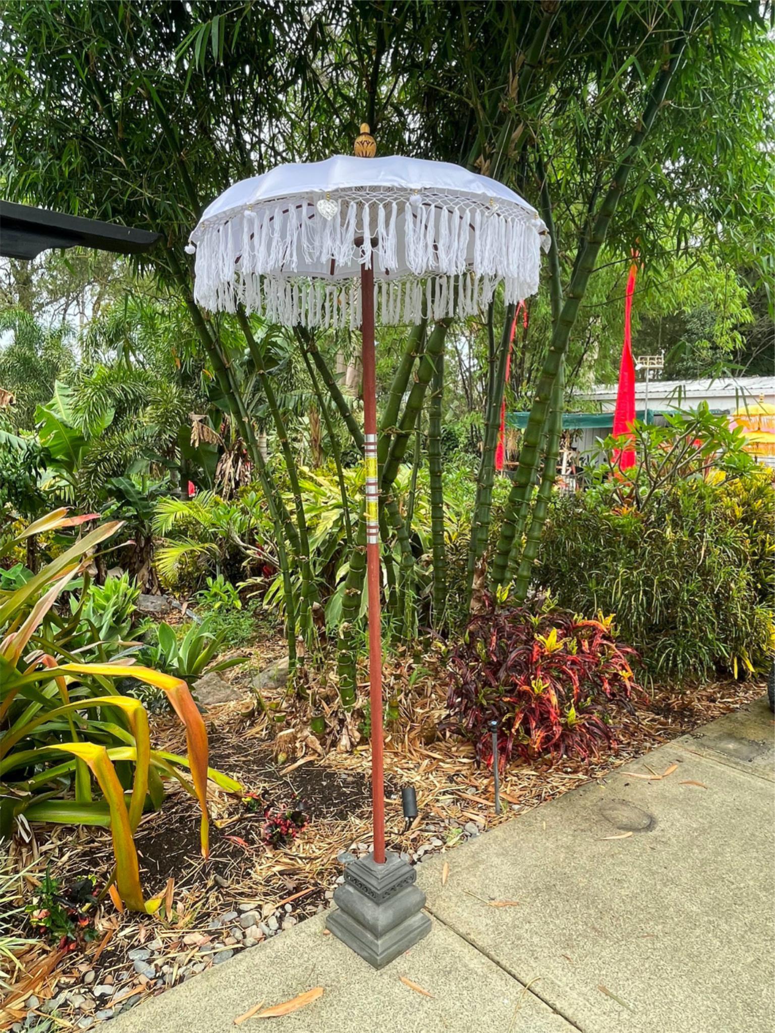 Add colour and Balinese charm to your garden or pool area with this gorgeous Balinese ceremony umbrella complete with beautiful decorative trim