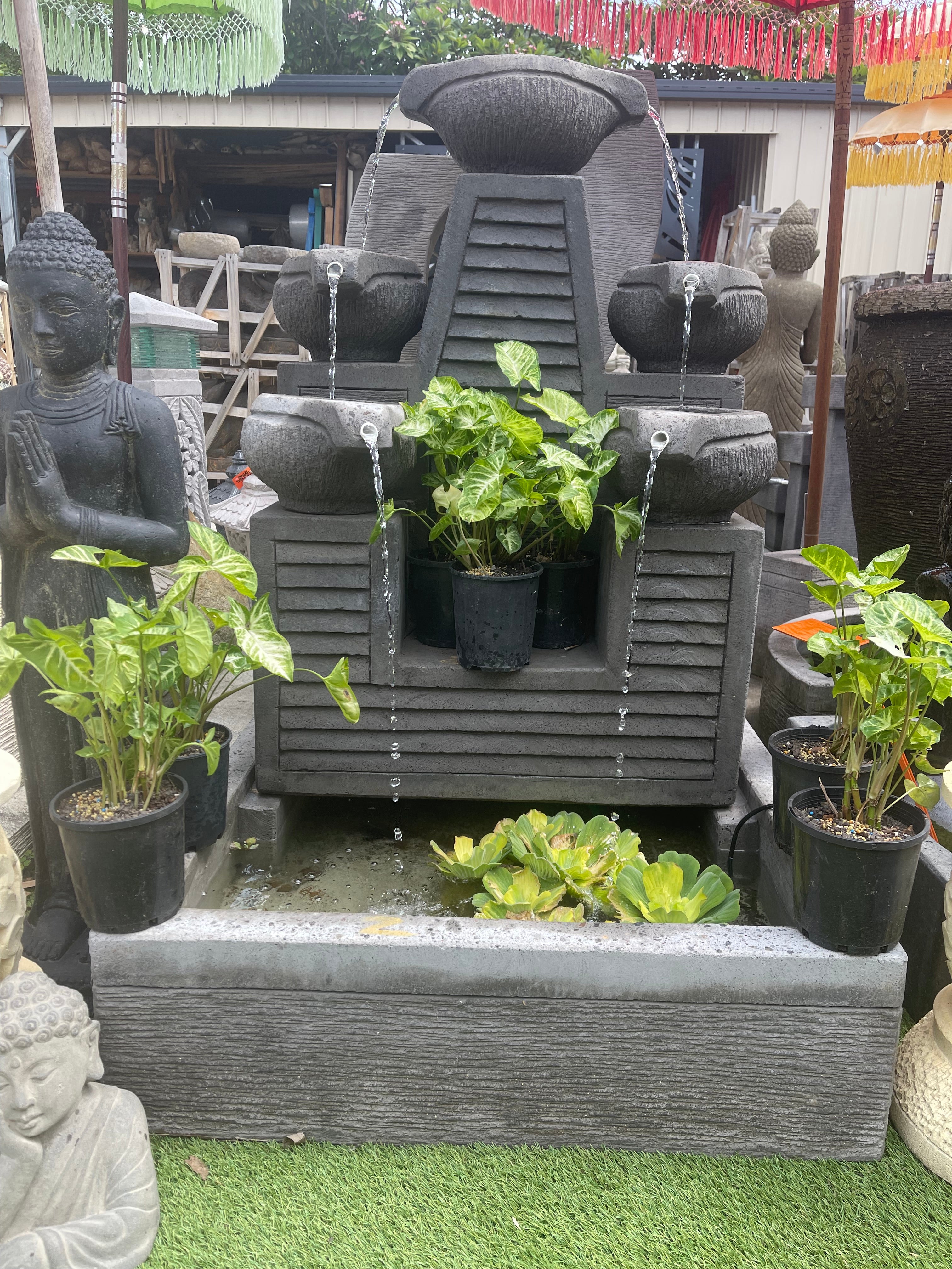This photo does not do this piece justice at all... but it is a lovely piece and versatile in as much as it has a blank shelf in the middle in which you can position your favourite sculpture or stature or even plant in a nice pot. The water is then running all around the centrepiece, finally falling into the base from height which creates great water sound. You can keep fish in the base of this piece along with water plants. It really is a lovely water feature!!