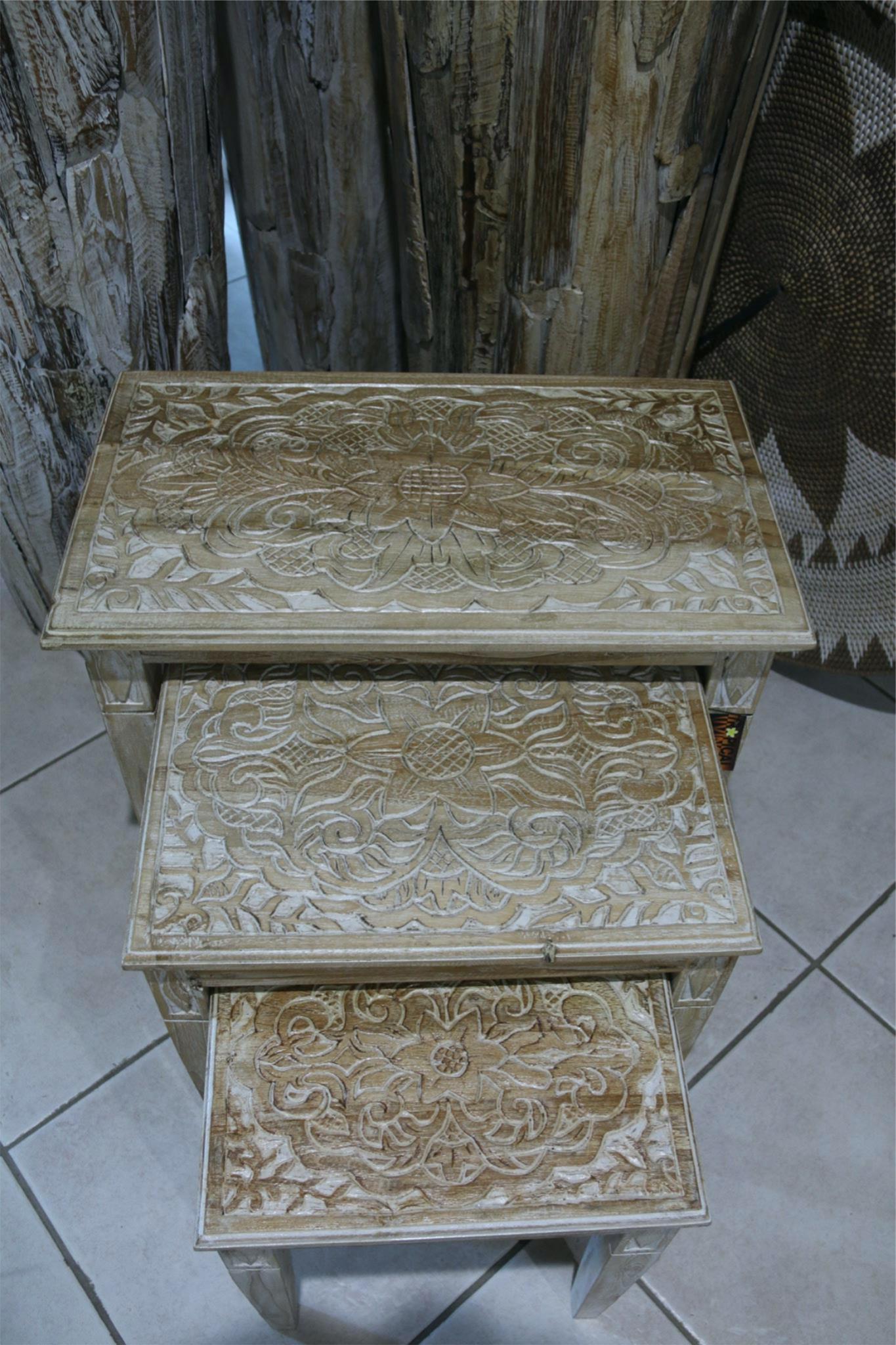 This stunning nest of 3 side tables is hand carved and crafted from quality TEAK WOOD.