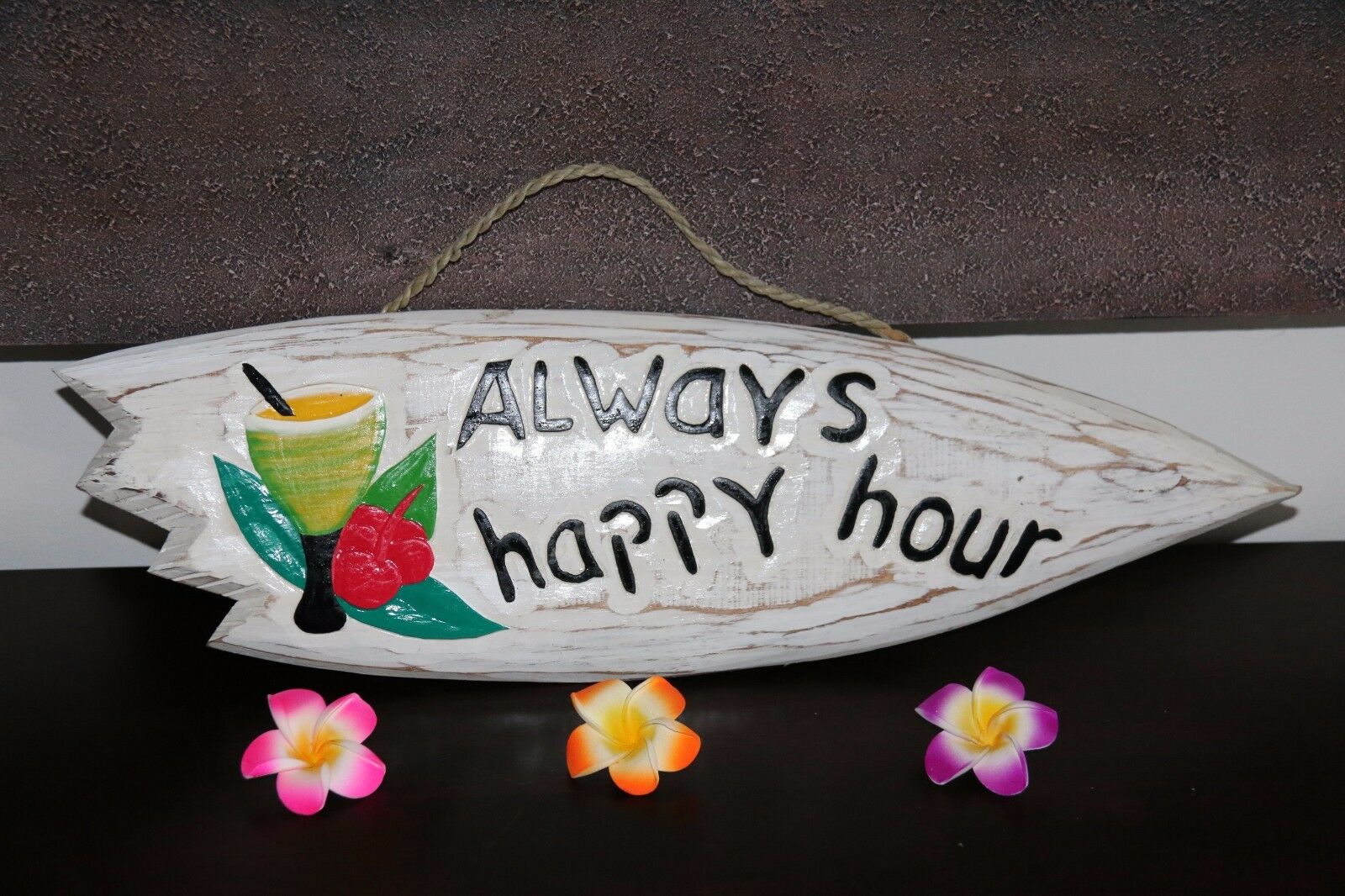 This hand crafted & carved Surfboard Shaped TIKI BAR ALWAYS HAPPY HOUR SIGN will add fun and charm to your Tiki Bar or entertaining area's