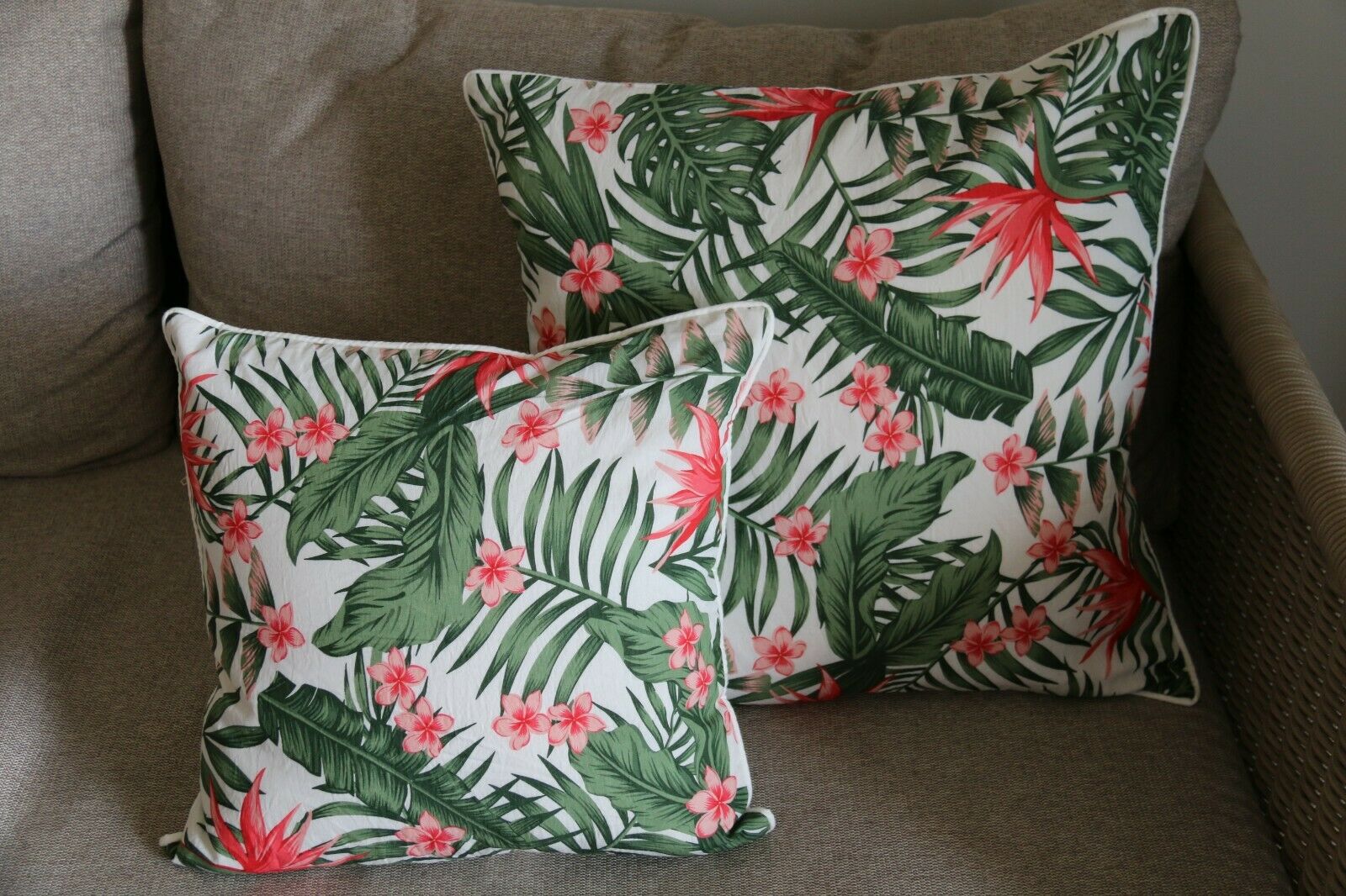 Do your living areas and bedrooms need brightening up?  We may have just the thing to add that bit of colour and some tropical charm to your home... These beautiful cushions are made from lovely quality cotton and have piping on the edges. Choose from the 2 sizes we have...