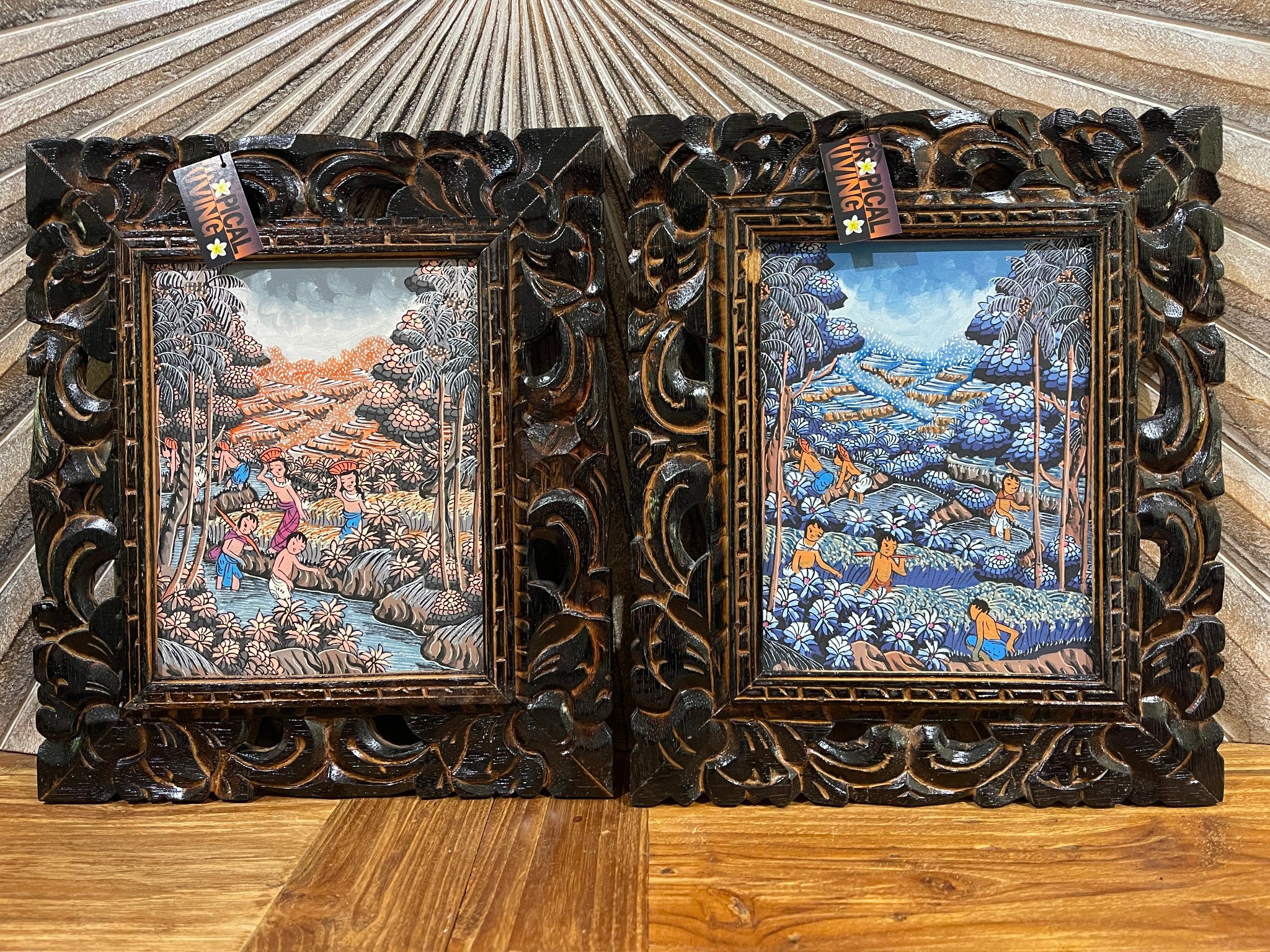 These traditional Balinese paintings are beautifully hand painted on canvas and framed in stunning Balinese Carved frame. Choose from the 2 styles available.